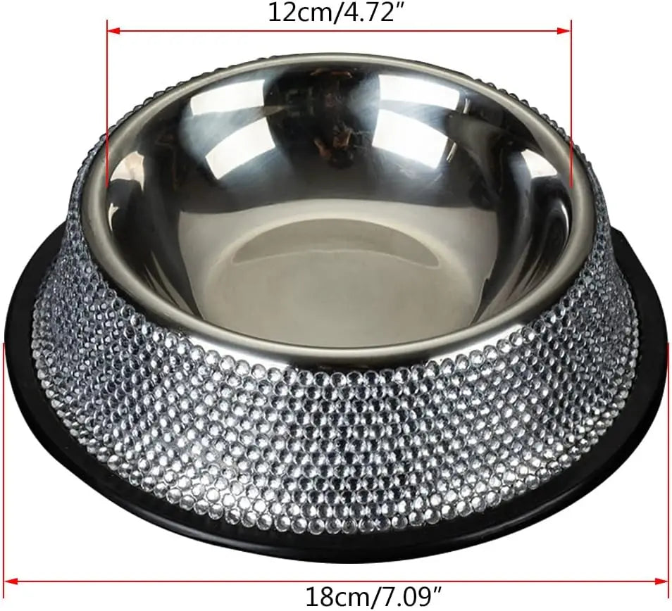✨🐾Dodaj odrobinę luksusu do codziennych posiłków swojego pupila! Nasza stainless steel miska ozdobiona błyszczącymi kryształkami to nie tylko praktyczne akcesorium, ale także elegancki dodatek, który przyciąga wzrok.