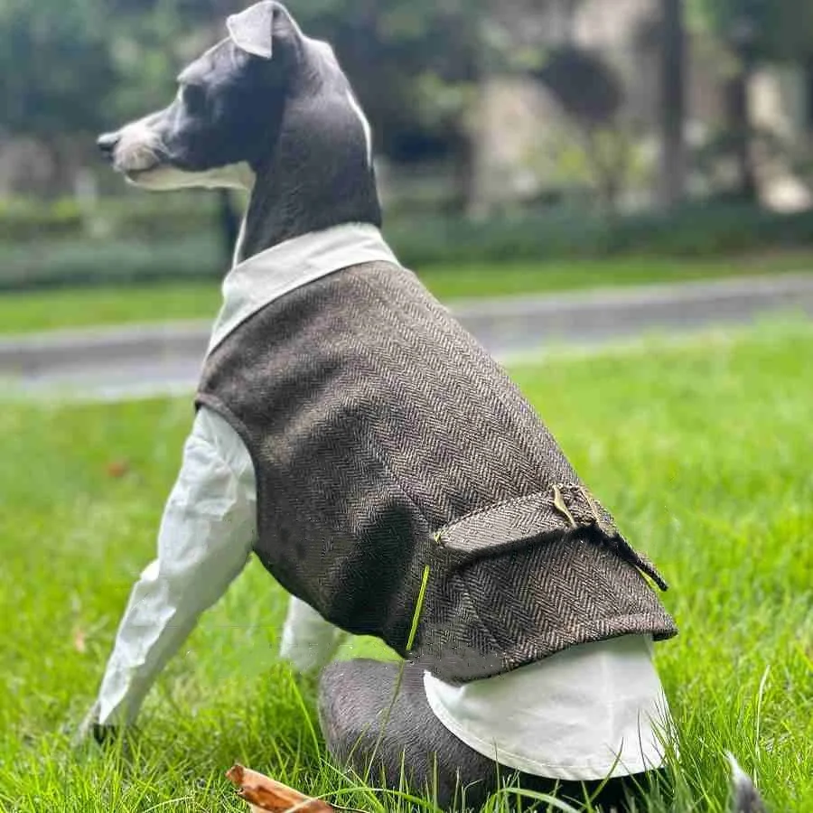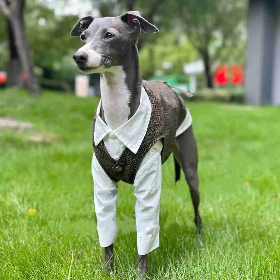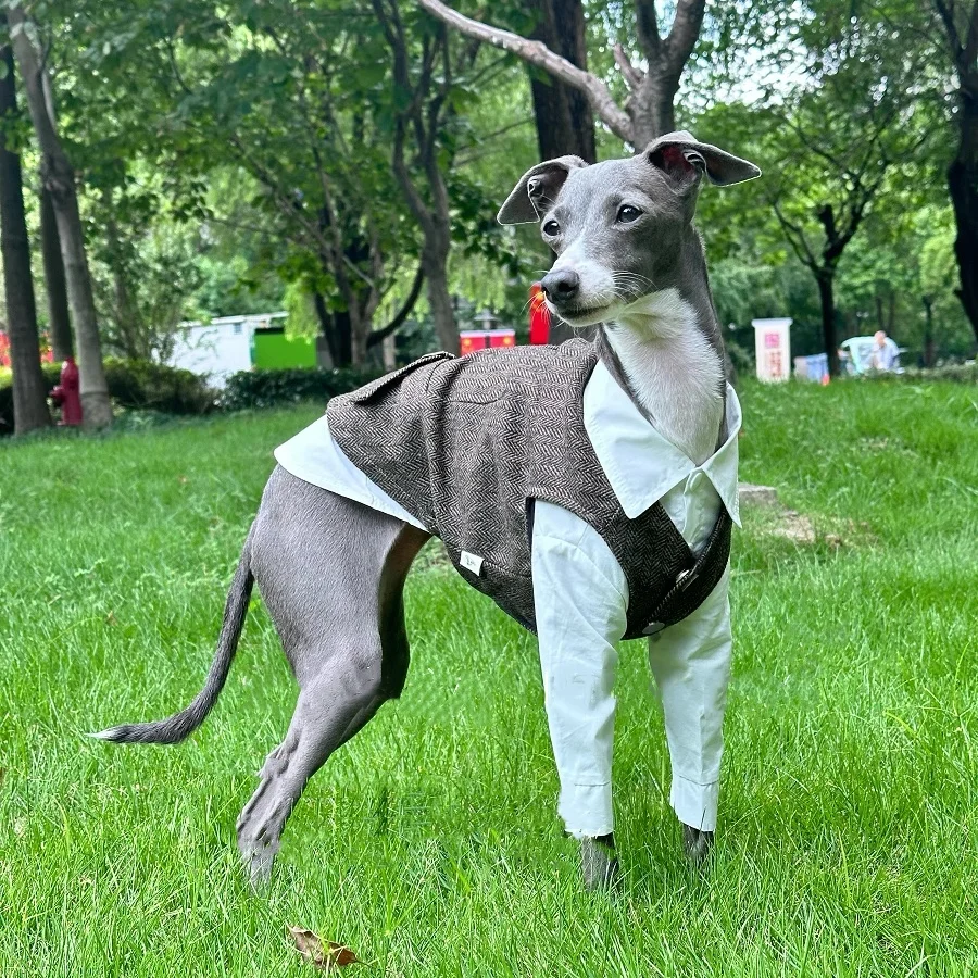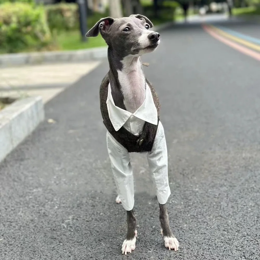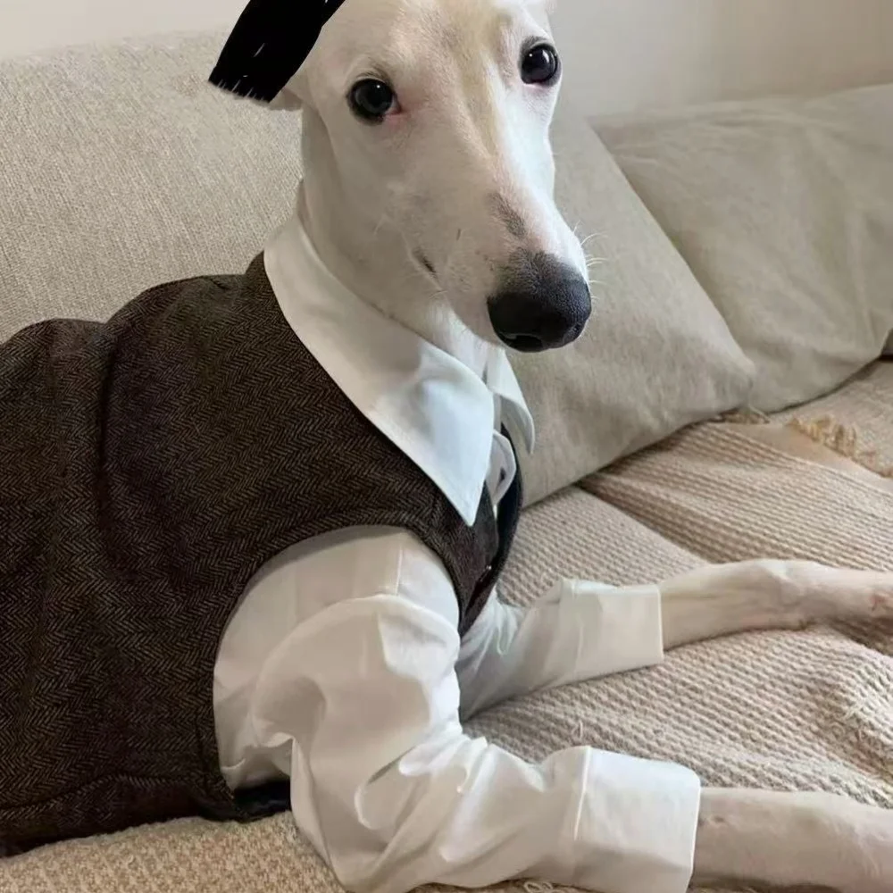 🐶 Twój pies zasługuje na elegancję w każdym spacerze! Autumn Retro British Style Dog Clothes to zestaw białej koszuli i szarej kamizelki, stworzony z myślą o Whippetach, Greyhoundach i psach małych oraz średnich ras.