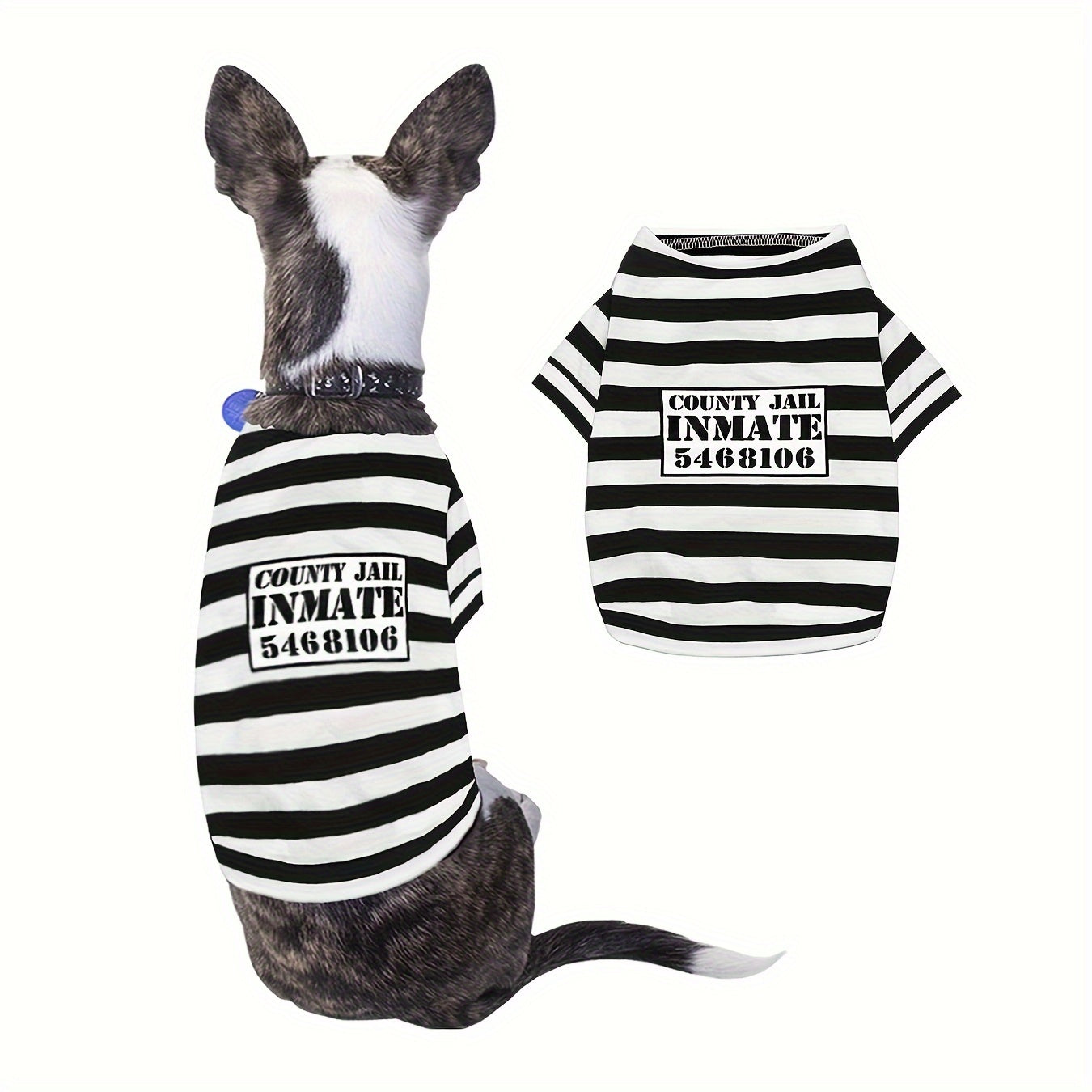 Zabawny kostium więźnia dla psa, wykonany z miękkiego futerka, idealny na Halloween lub tematyczne sesje zdjęciowe. Komfortowy, łatwy do zakładania i dopasowany do małych i średnich ras.