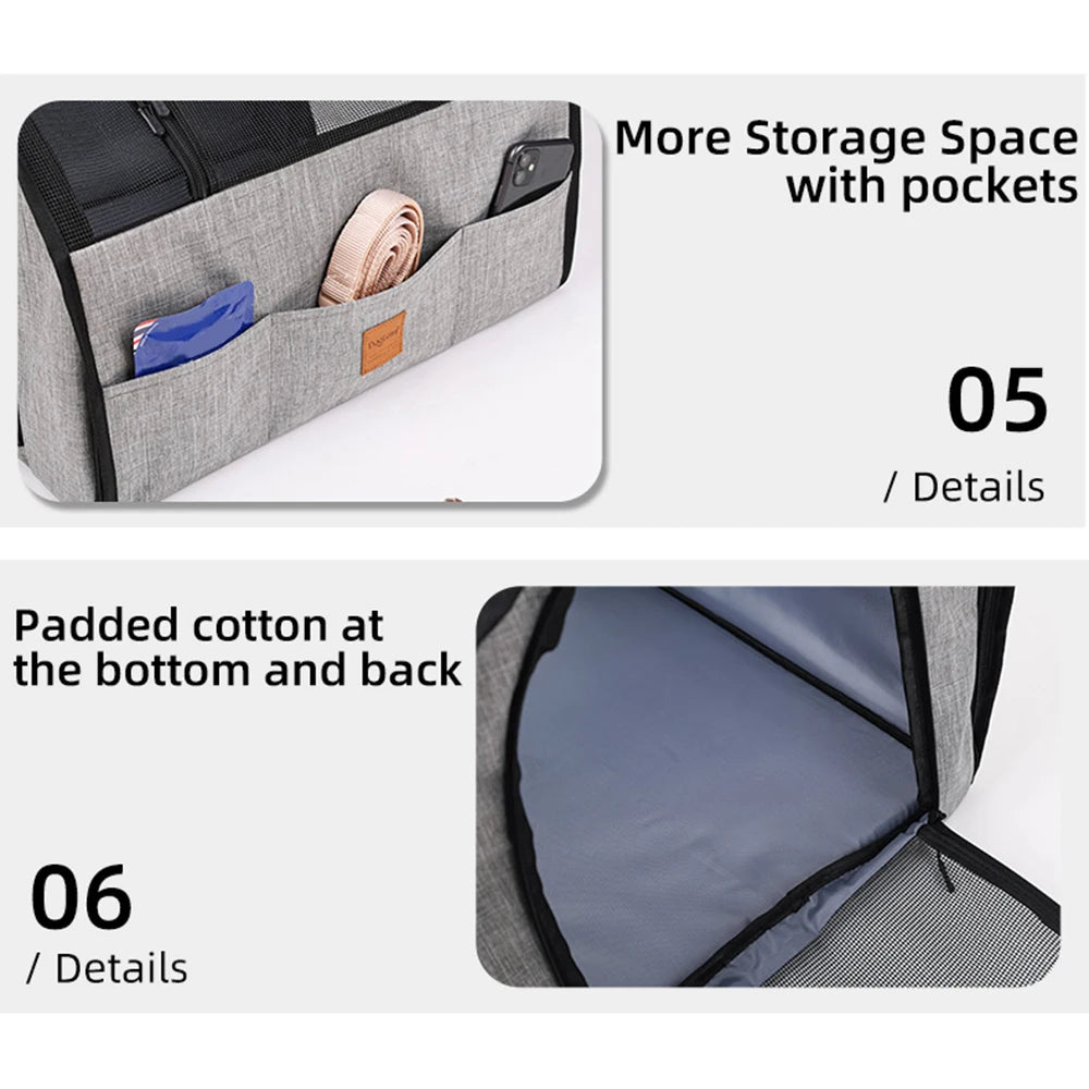 Multi-pocket Storage: It can carry more small items, making it convenient for owners to carry pet food and toys during travel.